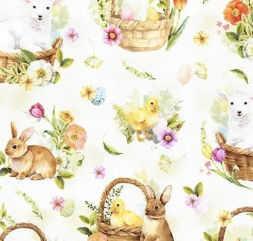 Easter Animal Fabric - Hoffman Fabrics - 100% Cotton - Easter Wonder - Animals in Baskets Vanilla W5426-156