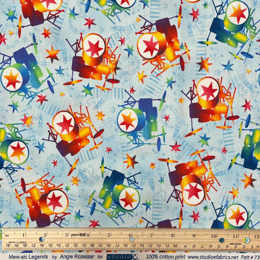 Drum Fabric - 7362-18 Blue/Red - Mew-sic Legends by StudioE - Multicolor drunk kit print by the yard - musician fabric rockstar drummer