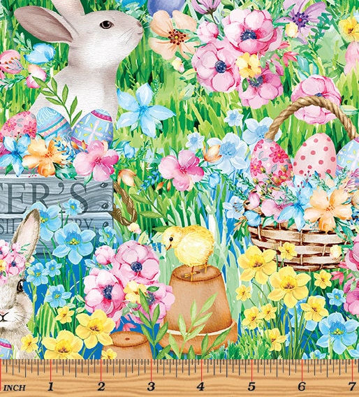Easter Bunny Fabric - Garden Scenic Multi - Benartex - 100% Cotton