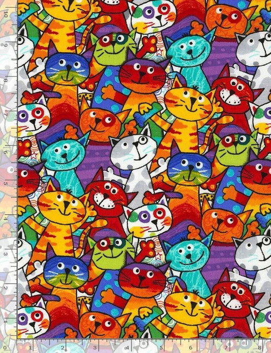 Rainbow Cat Fabric - Stacked Cats - Crazy for Cats Collection