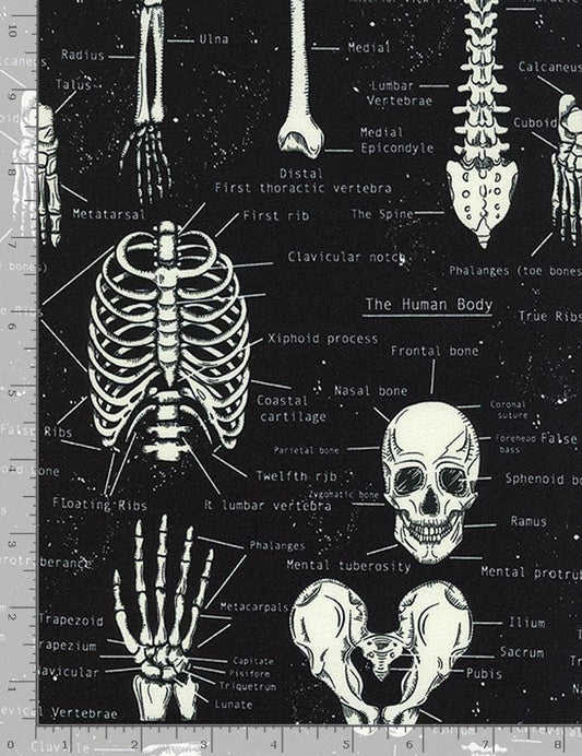 Skeleton Fabric - Anatomy - GLOW in the DARK - 100% Cotton- Medical fabric Doctor Nurse Bones