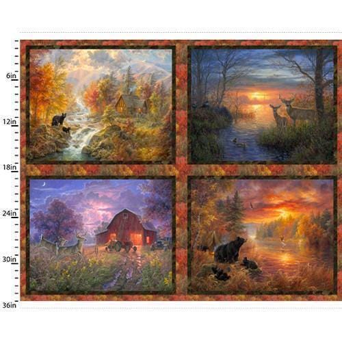 Dear and Bear Panel - 42" wide x 36" tall - Whitetail Country - 3 Wishes - 100% Cotton - Sunset Tree fabric forest animals