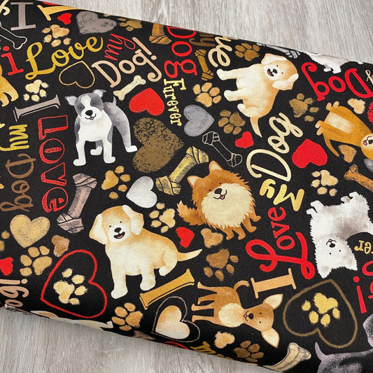 Tossed Dogs & Words - Happiness Has Paws - Timeless Treasures - 100% Cotton - I love my dog